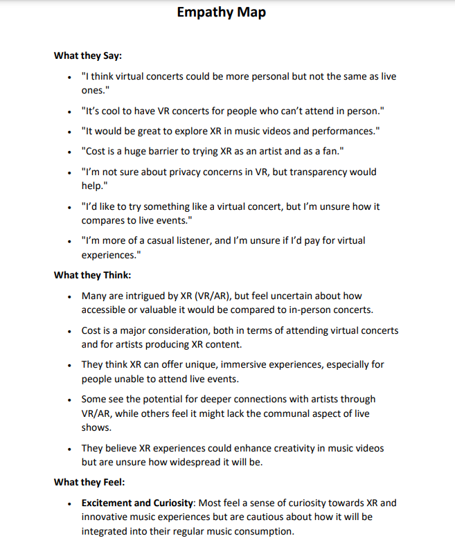 The idea is to design virtual concerts where fans can experience enhanced performances through AR visuals, interact with 3D effects, and connect with artists and other attendees in real-time. These concerts could be accessed from home or at AR-enabled venues, offering a completely new way to enjoy live music. By looking into existing platforms and understanding what music fans enjoy, this project will develop a prototype that shows how AR can transform virtual concerts. The focus is on creating innovative experiences that are fun, engaging, and push the boundaries of how people interact with music.